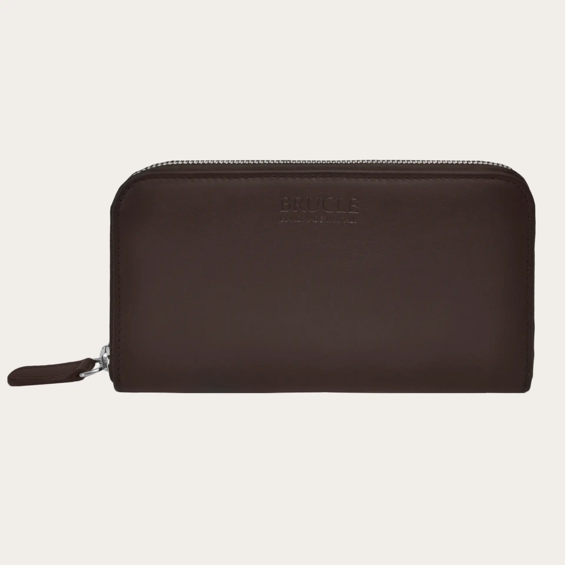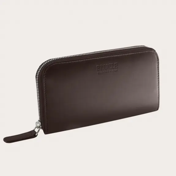 Portefeuille femme en cuir avec fermeture éclair, marron foncé