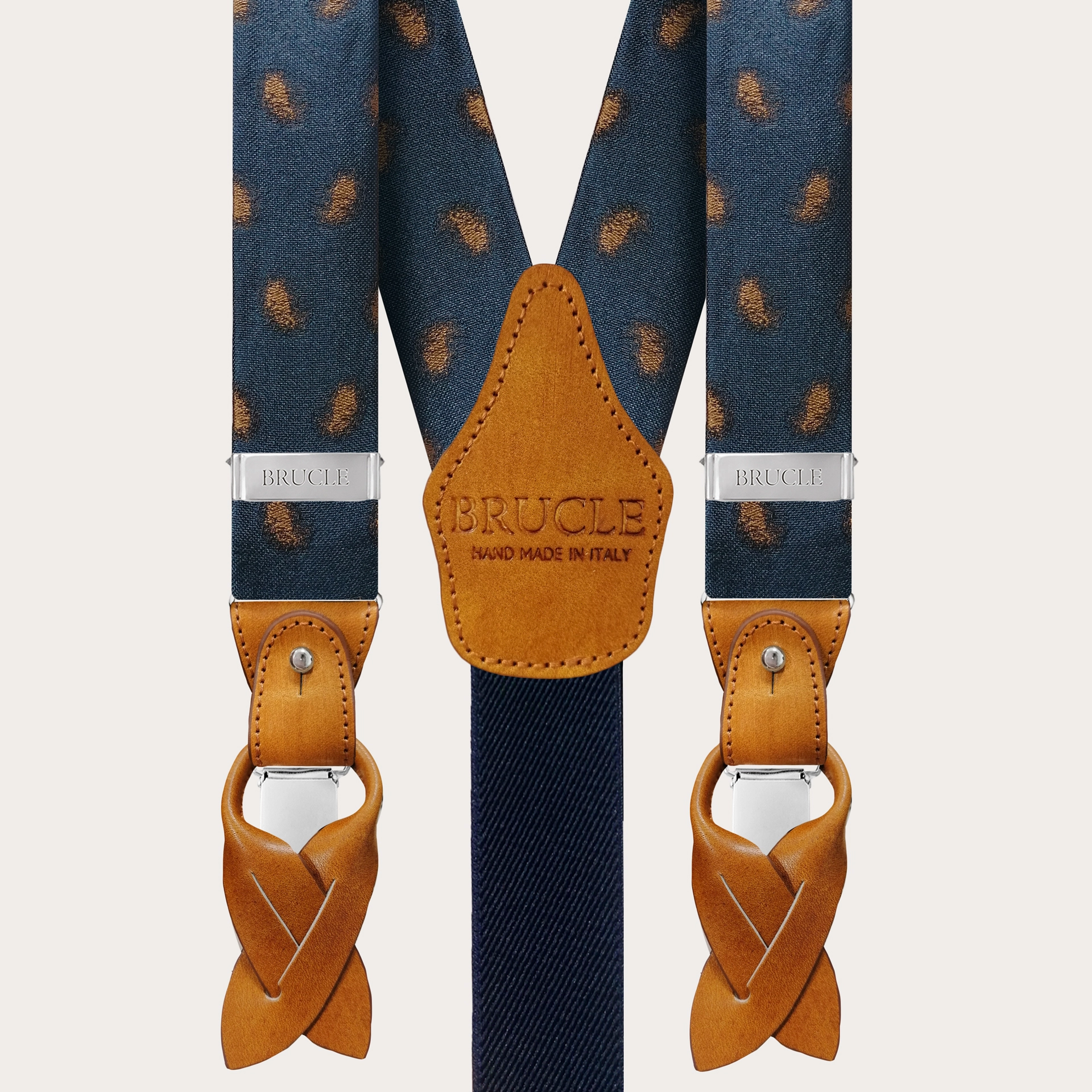 Parfaites pour toutes les occasions, les bretelles paisley bleues de Brucle s'adaptent à chacune de vos tenues, privilégiant un style élégant et raffiné. Grâce à leur double utilisation avec des boutons ou des clips, vous pouvez personnaliser votre look selon vos préférences et vos besoins. De plus, comme toutes nos bretelles pour hommes, elles sont personnalisables avec des gravures sur les clips et les extrémités en cuir, pour un produit unique qui souligne votre style dans les moindres détails. Choisissez l'élégance intemporelle des bretelles en soie Brucle, un véritable symbole du luxe artisanal italien.