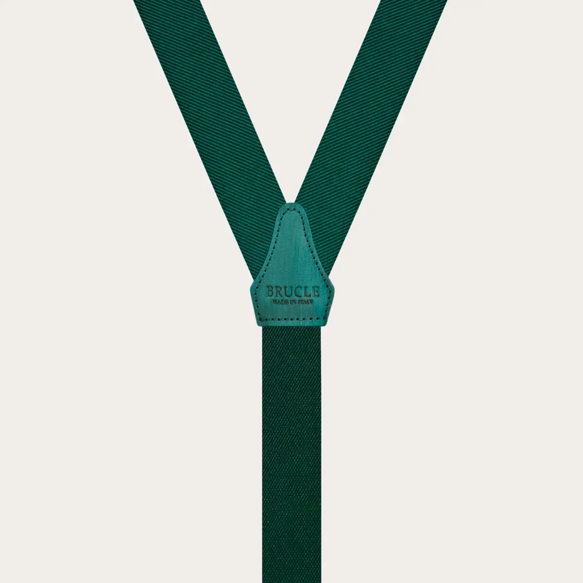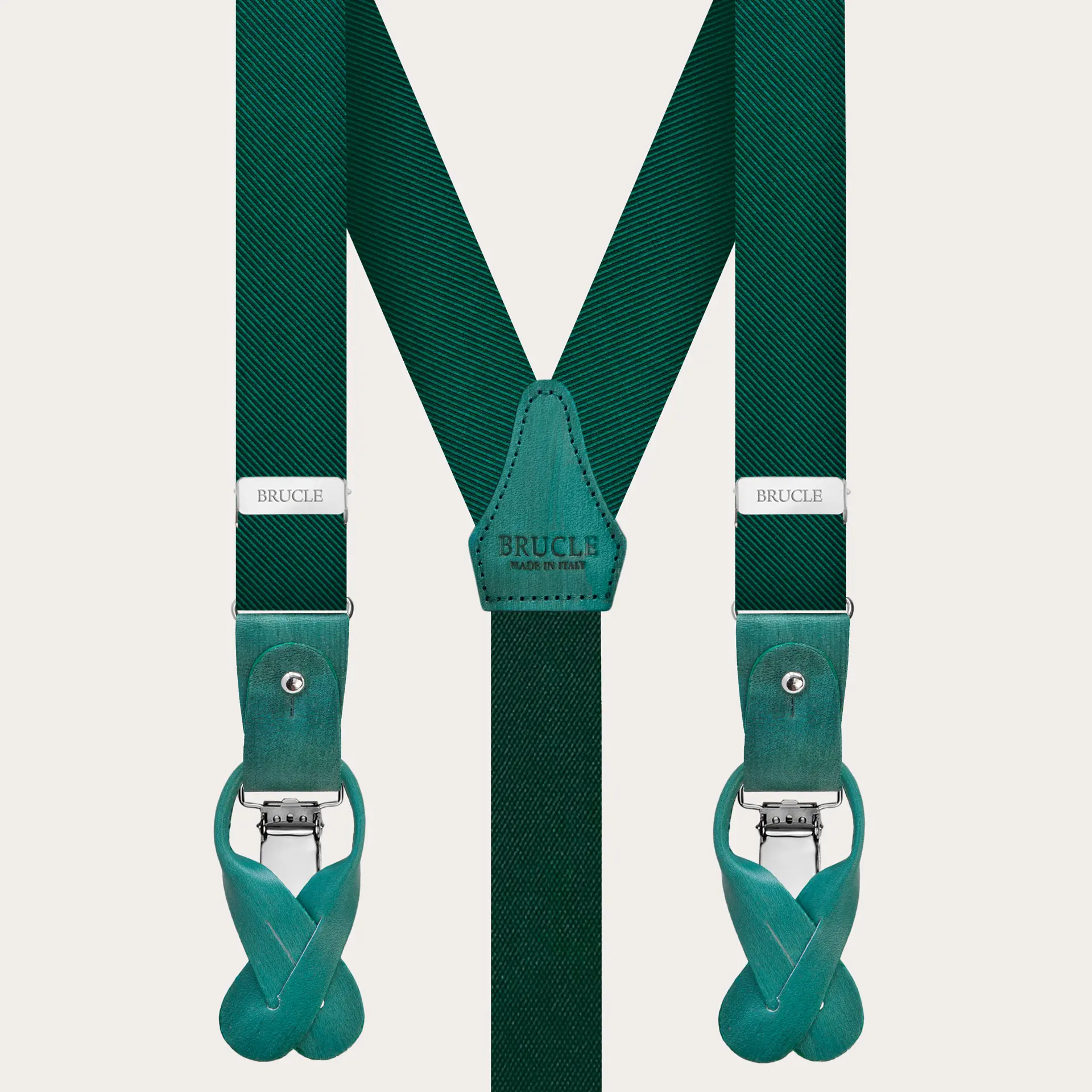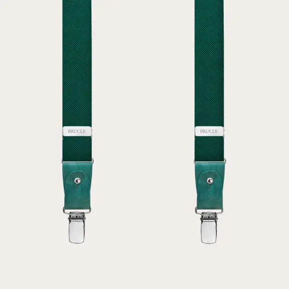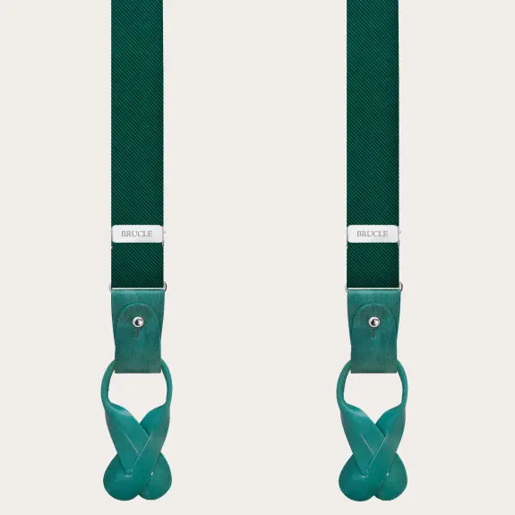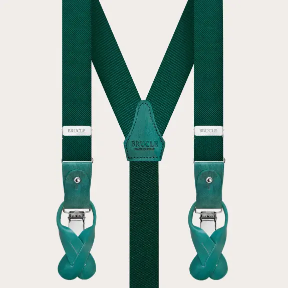 Comme toutes les bretelles Brucle, les bretelles en soie jacquard vertes peuvent également être personnalisées avec des gravures de pièces en cuir et de clips, et peuvent être réalisées sur mesure également en tailles confortables.