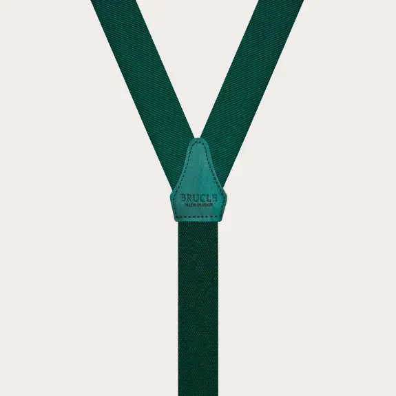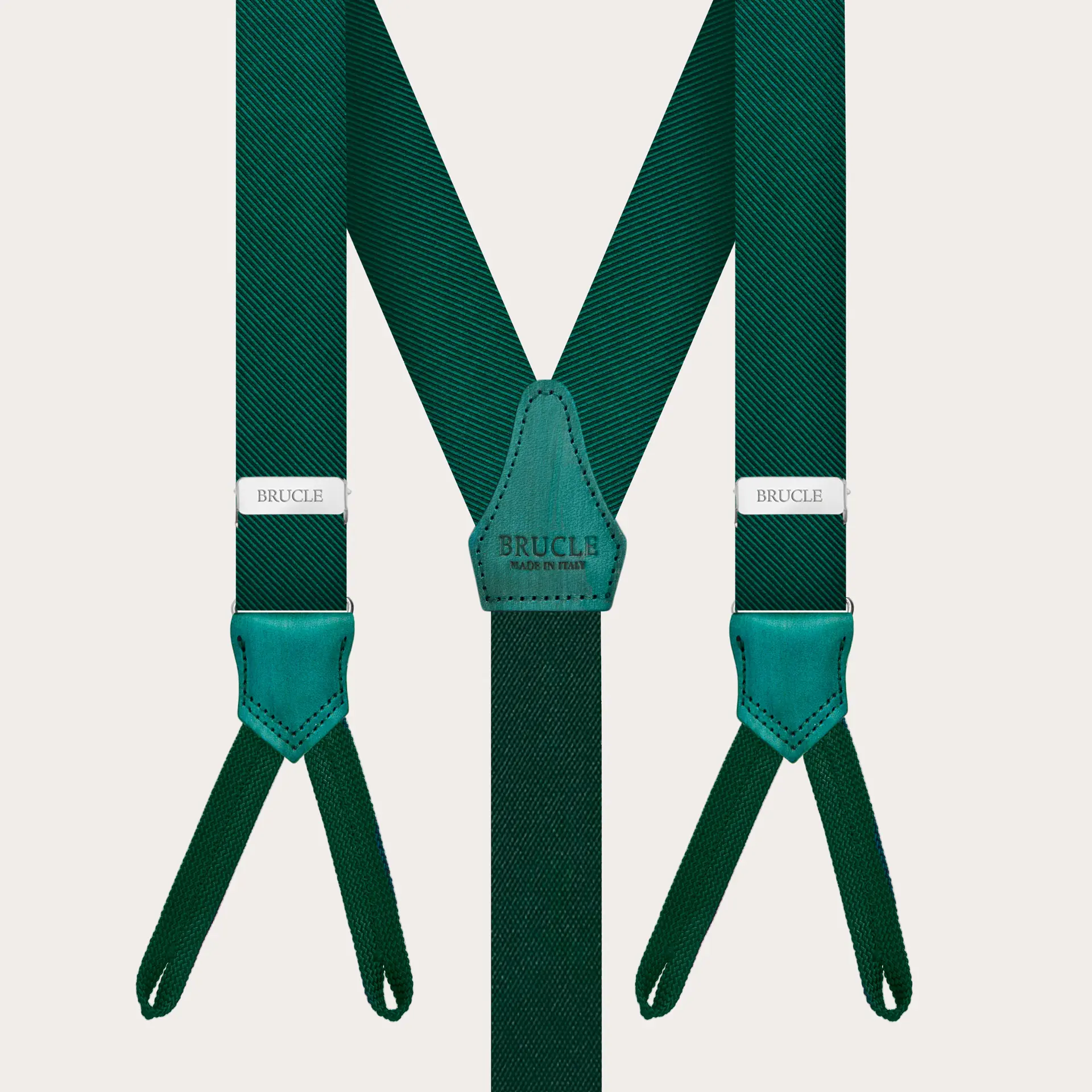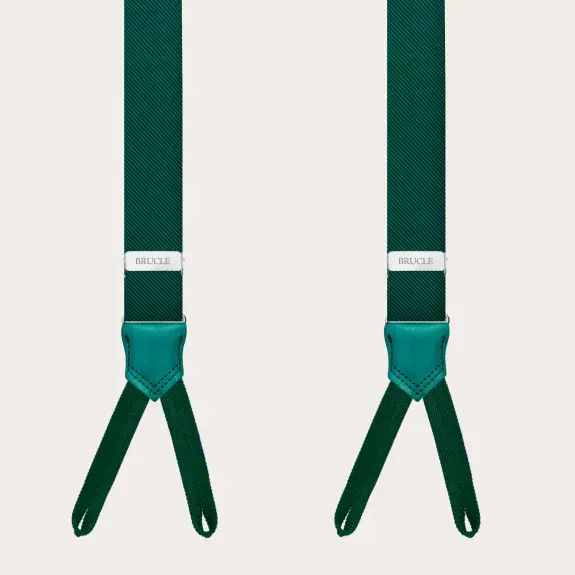 Découvrez les bretelles pour hommes Brucle : originales et sophistiquées, nos bretelles vertes étroites avec des boucles pour boutons sont l'emblème de l'élégance italienne. Réalisées en précieuse soie jacquard et embellies de détails en cuir coloré à la main, ces bretelles unissent tradition et innovation.