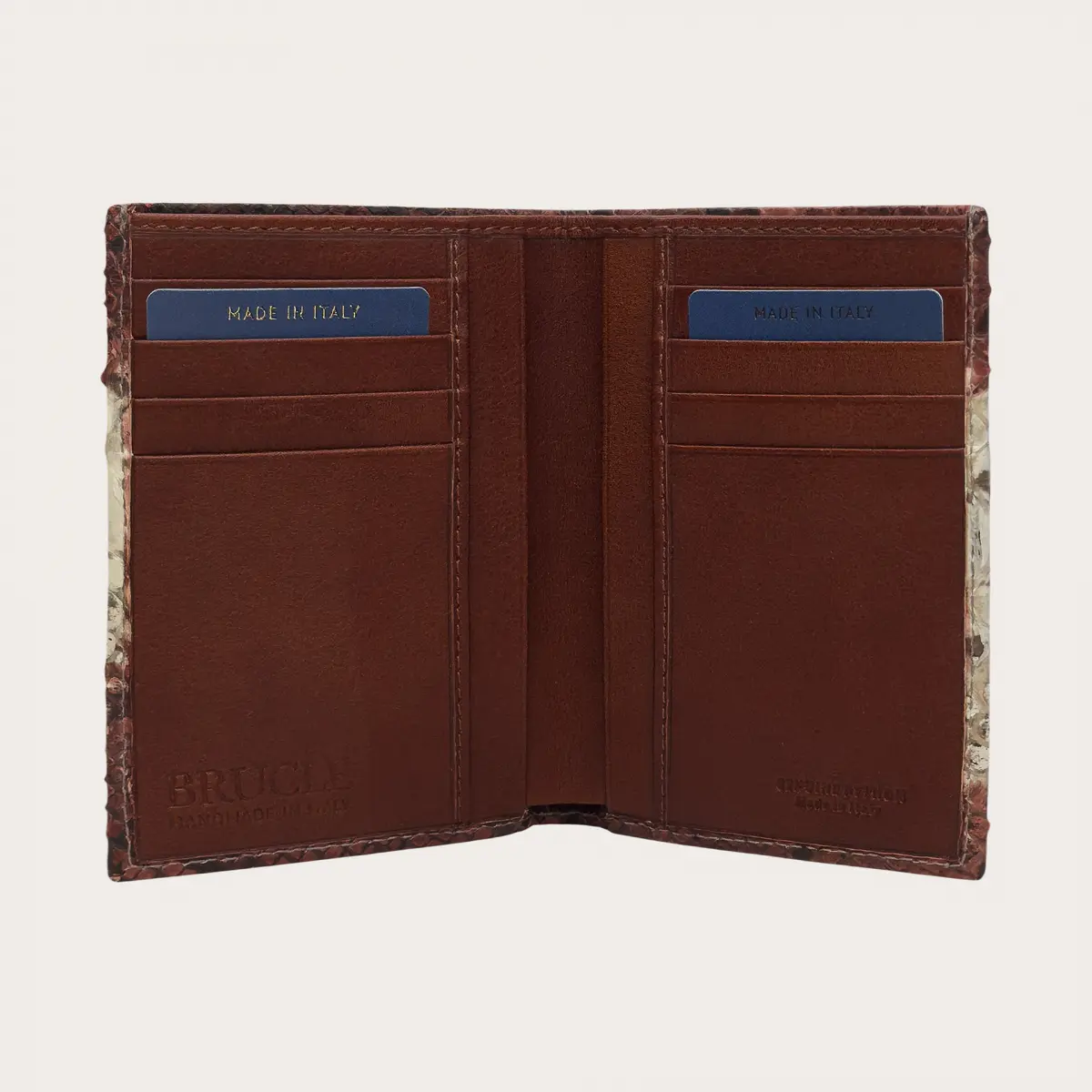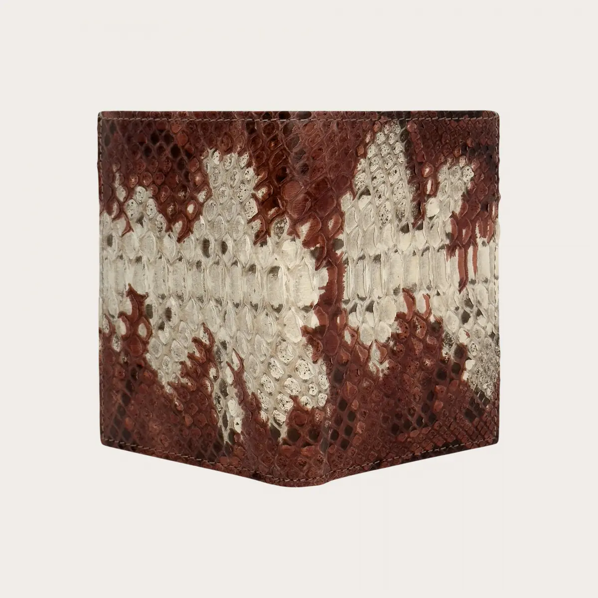 Portafoglio verticale cognac e bianco in vero pitone, un modello capiente ed elegante tamponato a mano.