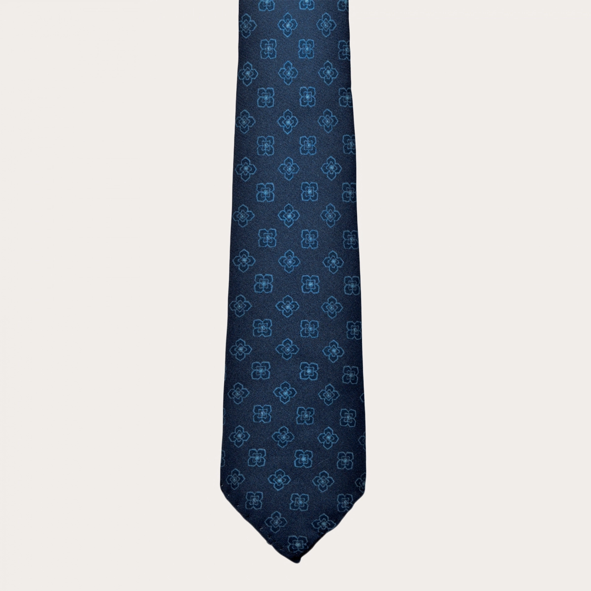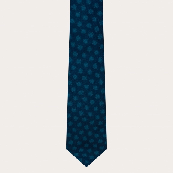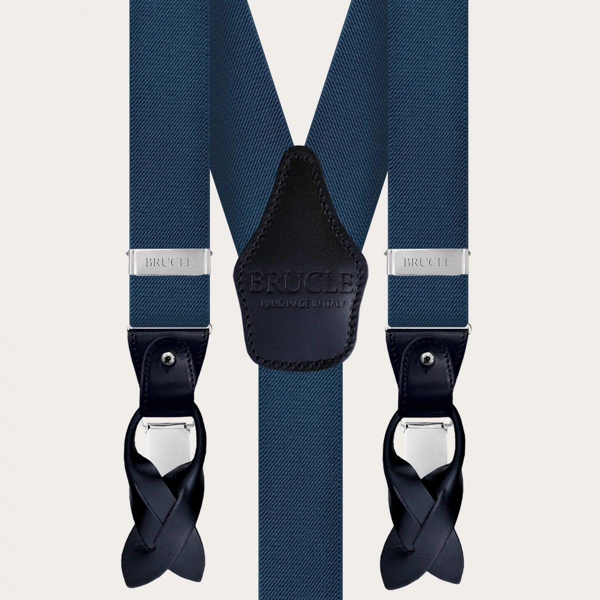 Elegante set nei toni del blu in cui il colore delle bretelle vede un raffinato richiamo nei pois di cravatta e fazzoletto da taschino, così come le parti in pelle blu scuro sono richiamate dallo sfondo della seta, per un combinato che unisce comodità e classe.
