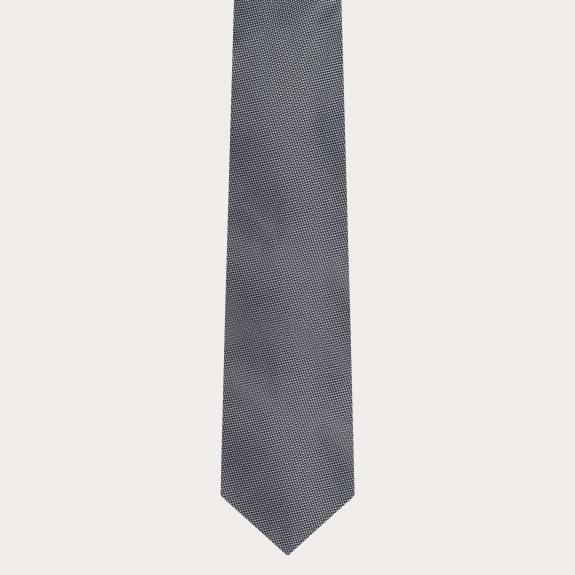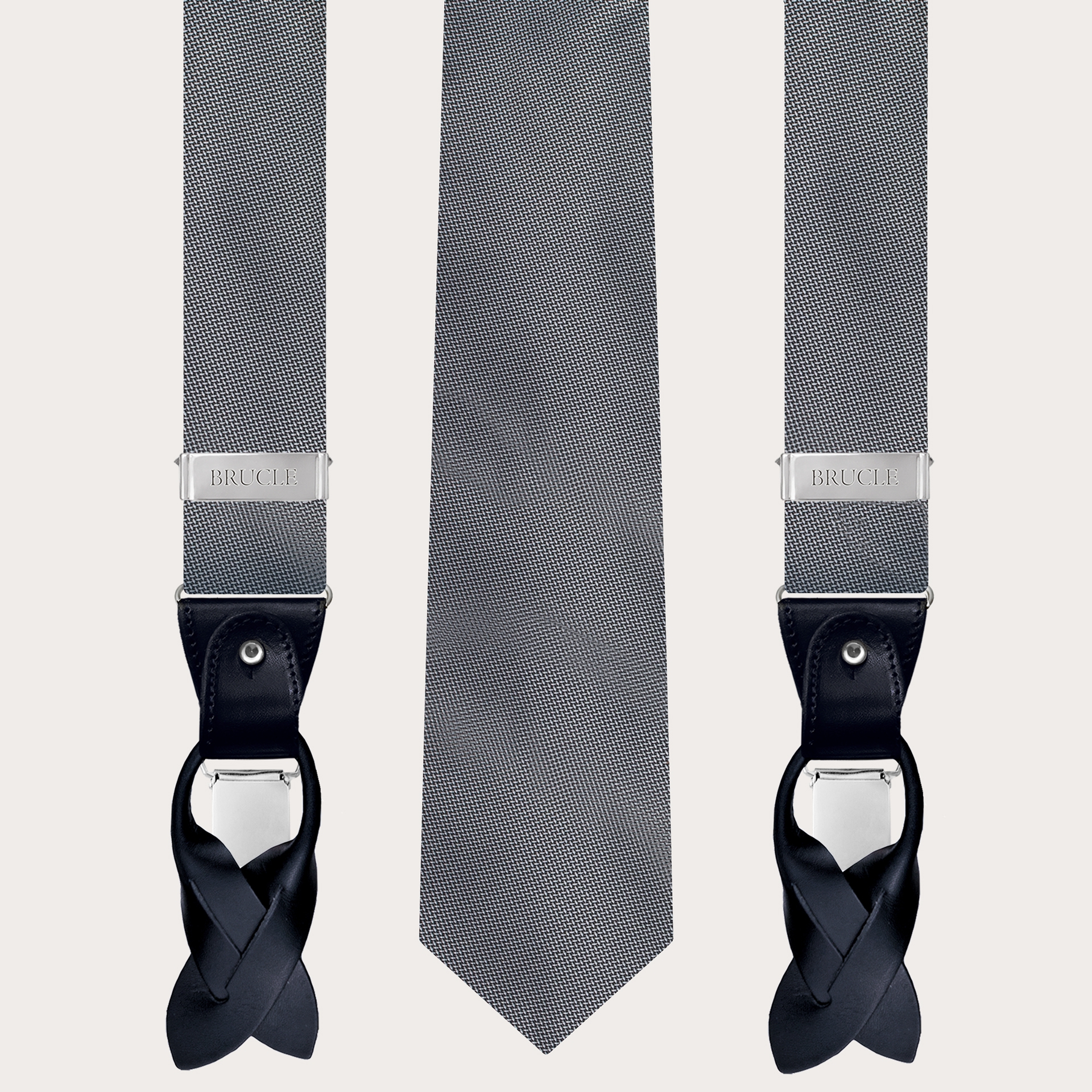 Pacchetto composto da bretelle e cravatta in raso di seta grigia, un modello di bretella e cravatta indicato per cerimonie e matrimoni.