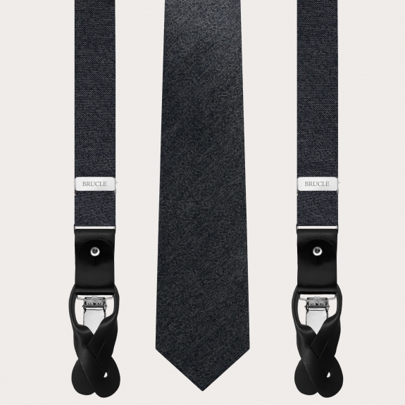 Raffinate bretelle uomo in seta grigia, con parti in pelle a contrasto di colore nero.
