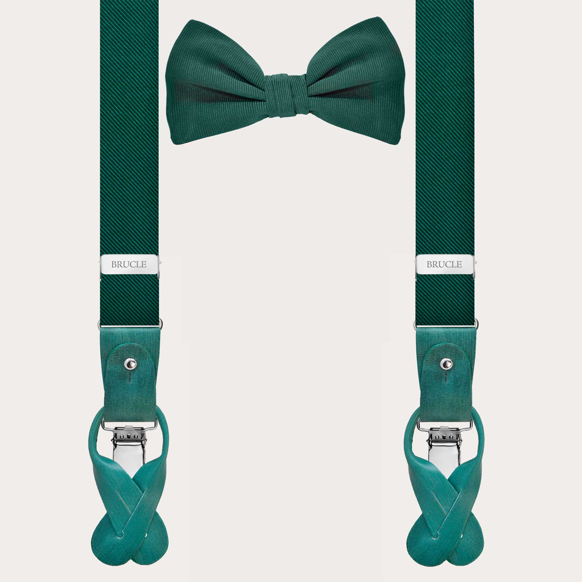 Raffinato set coordinato composto da bretelle strette verdi in seta e papillon pre-annodato verde, un set coordinato in seta jacquard di alta qualità fatto a mano in Italia.