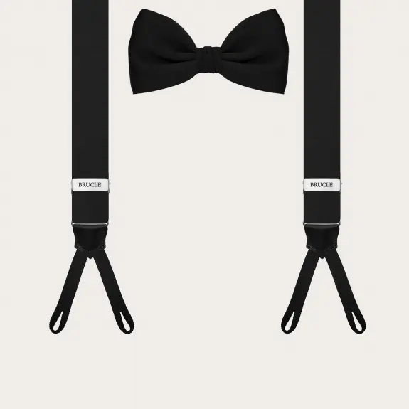 Pacchetto composto da bretelle nere per bottoni e papillon nero in raso seta