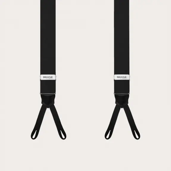 Le bretelle strette nere in raso di seta per bottoni sono interamente fatte a mano. Grazie ai regolatori e all'asta posteriore elastica, garantiscono una perfetta vestibilità in ogni occasione.