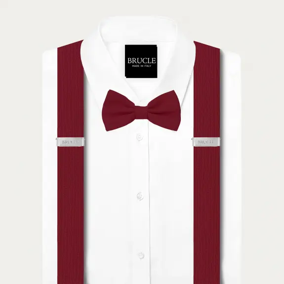 Le bretelle larghe in seta bordeaux sono versatili e possono essere indossate con i bottoni o con le clip. Il papillon pre-annodato in seta bordeaux abbinato aggiunge un tocco esclusivo al tuo look ed è subito pronto per essere indossato, garantendoti il massimo dell'eleganza artigianale italiana. Disponibile anche il fazzoletto da taschino abbinato.