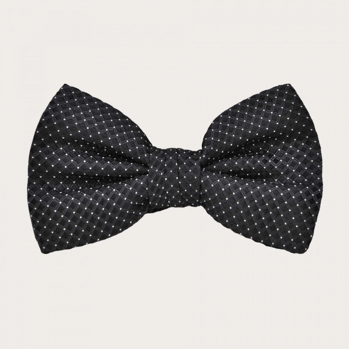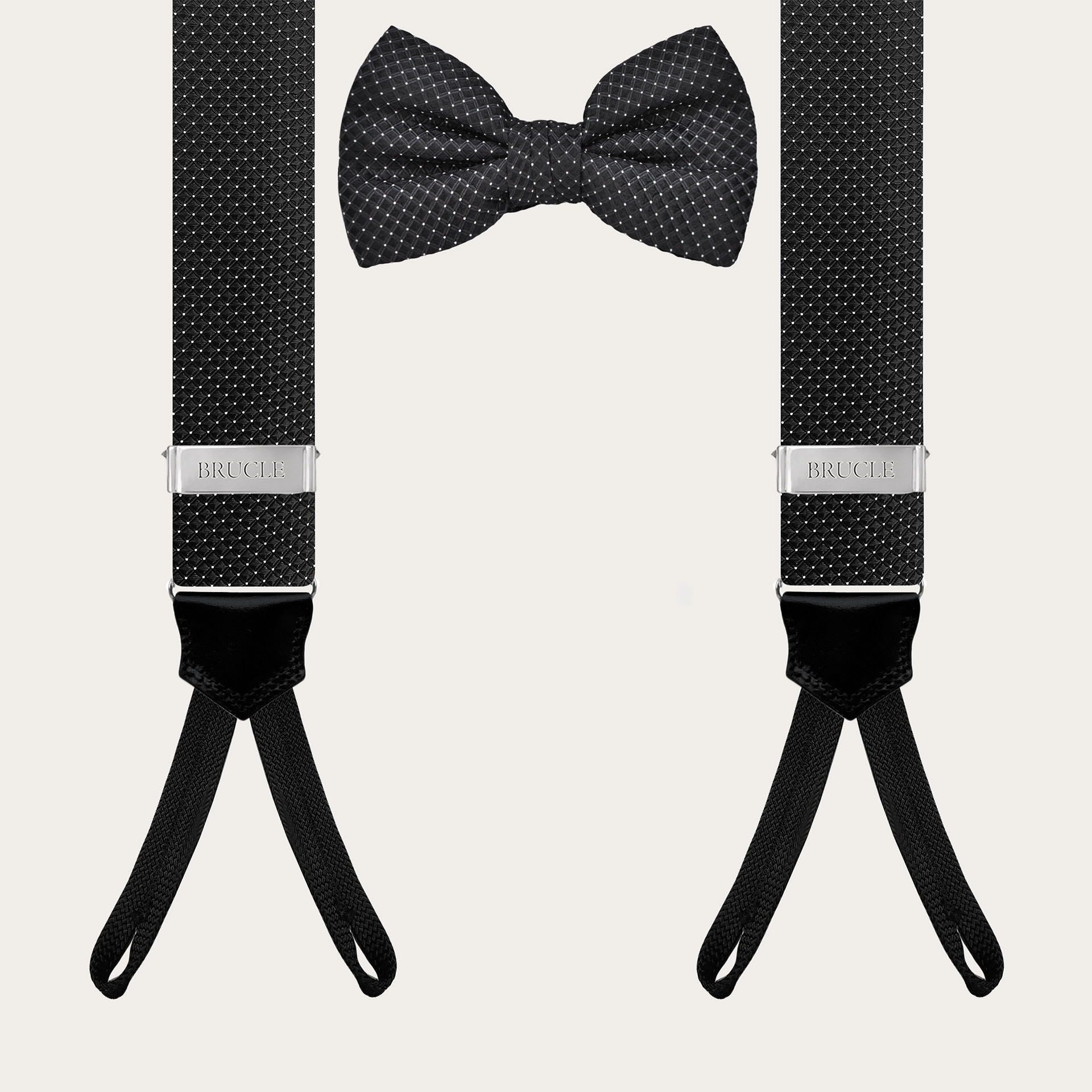 Elegante set coordinato in seta nera con motivo puntaspillo, composto da bretelle larghe con asole per bottoni e un papillon pre-annodato realizzato nella stessa seta di alta qualità. Il sofisticato colore nero e la trama a diamante conferiscono a questo set un tocco di stile raffinato.