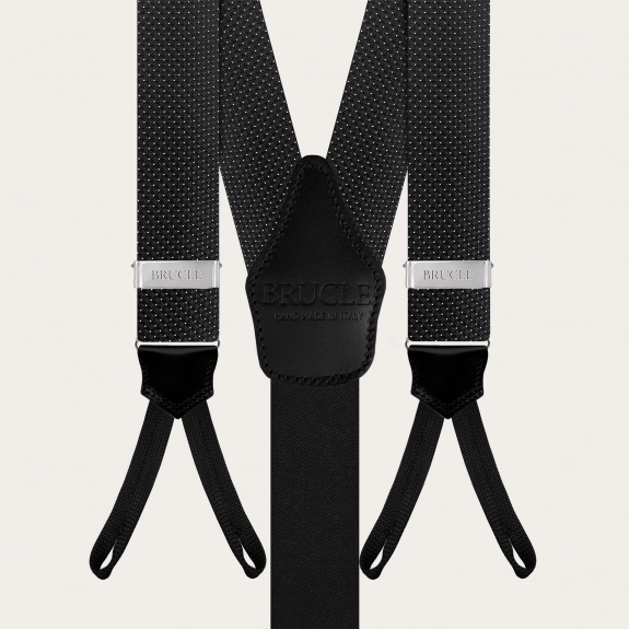 Le bretelle in seta a pois nera, con una larghezza classica di 3,6 cm, sono appositamente pensate per essere indossate con bottoni, offrendo un look elegante e senza tempo. Ogni dettaglio di queste bretelle è stato accuratamente realizzato, dall'uso di materiali pregiati alla vestibilità perfetta, garantita dall’elastico sul retro.