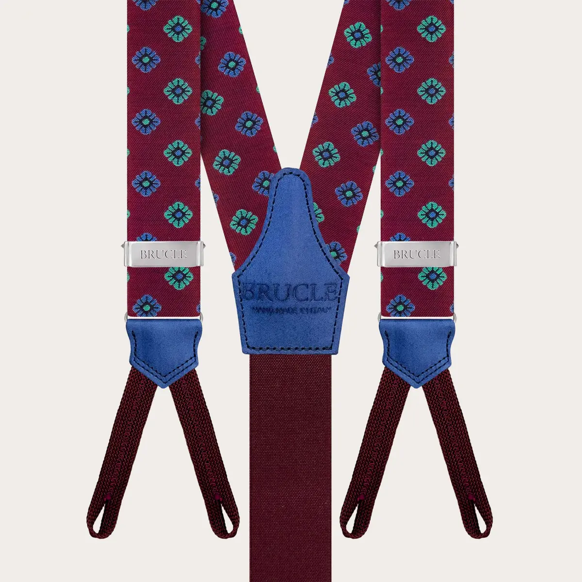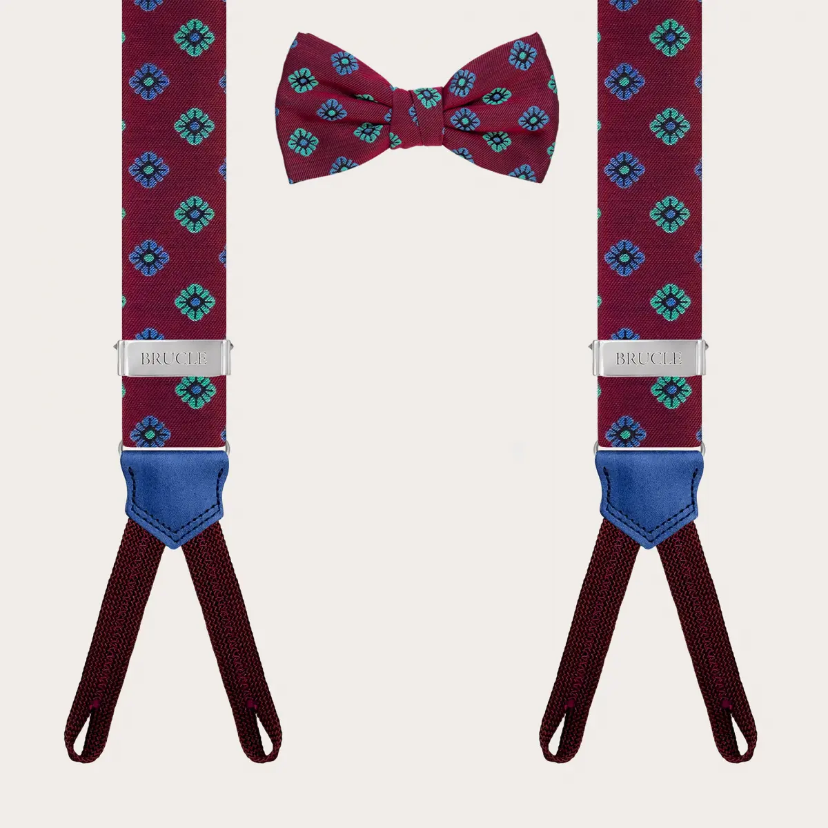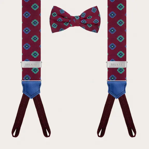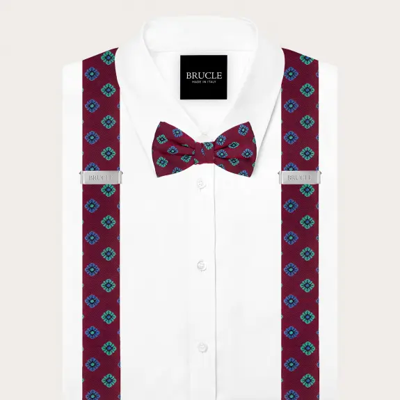 Bretelle e papillon coordinati in seta bordeaux a fiori