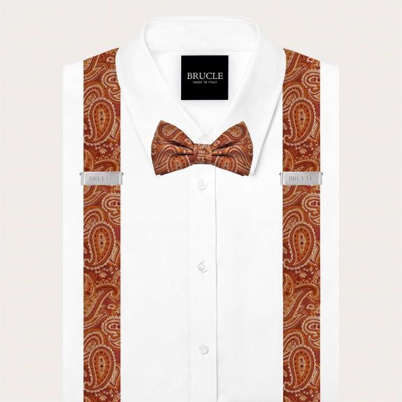 Bretelle per bottoni e papillon coordinati in seta paisley arancione