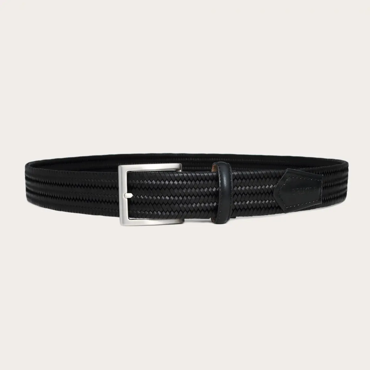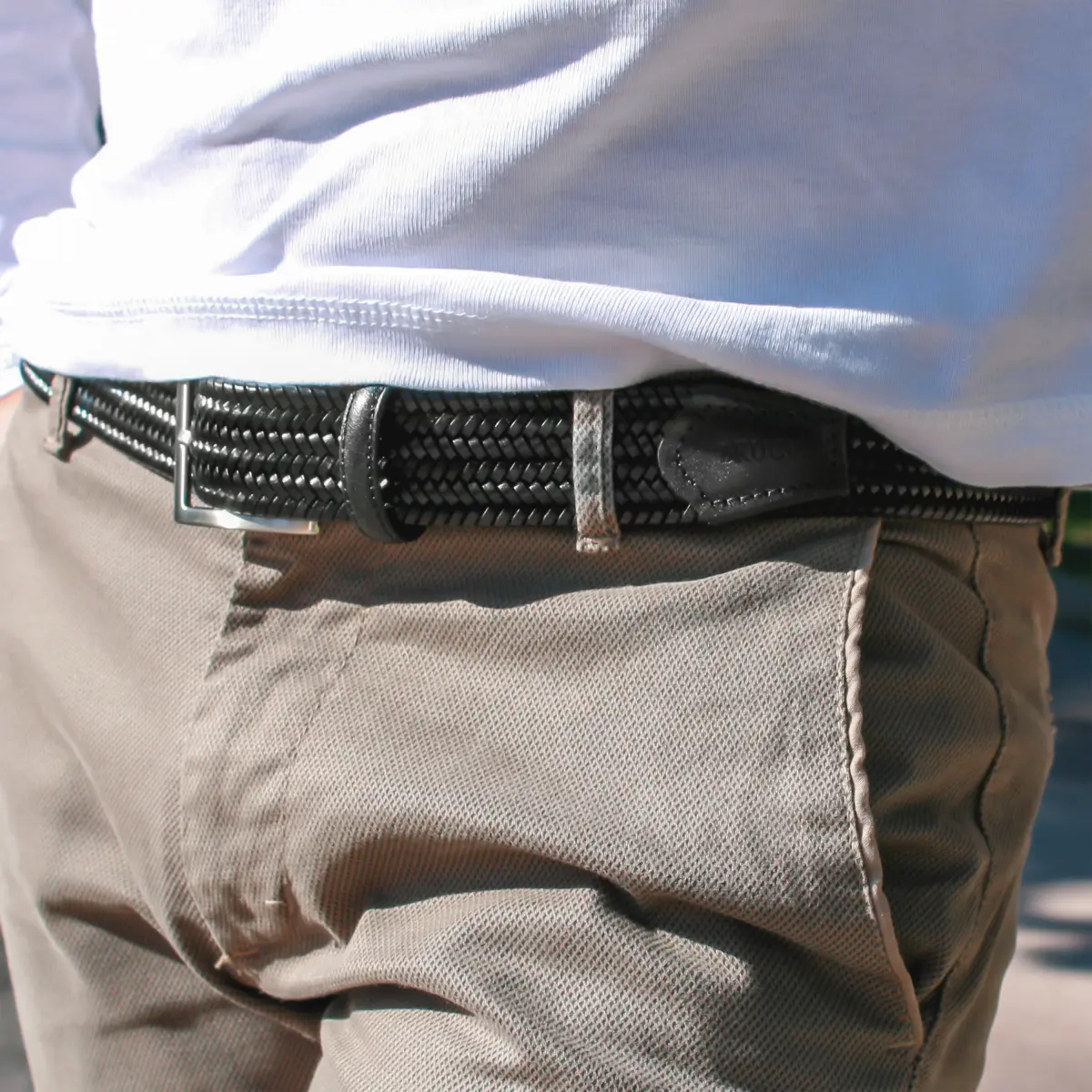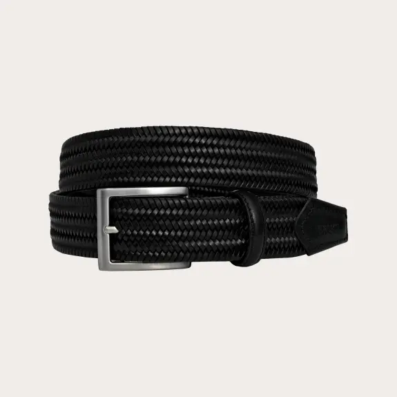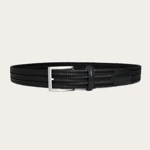 Cintura extra lunga nera in cuoio rigenerato intrecciato elastico con fibbia anallergica nichel free.