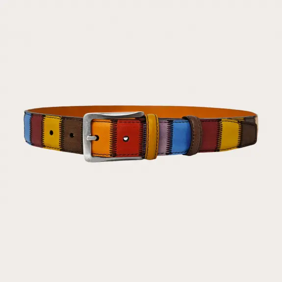 Cintura multicolore in vera pelle cucita con lavorazione patchwork. Un accessorio unico, impreziosito non solo dai colori rigorosamente dati a mano, ma anche dalla morbida fodera arancio.