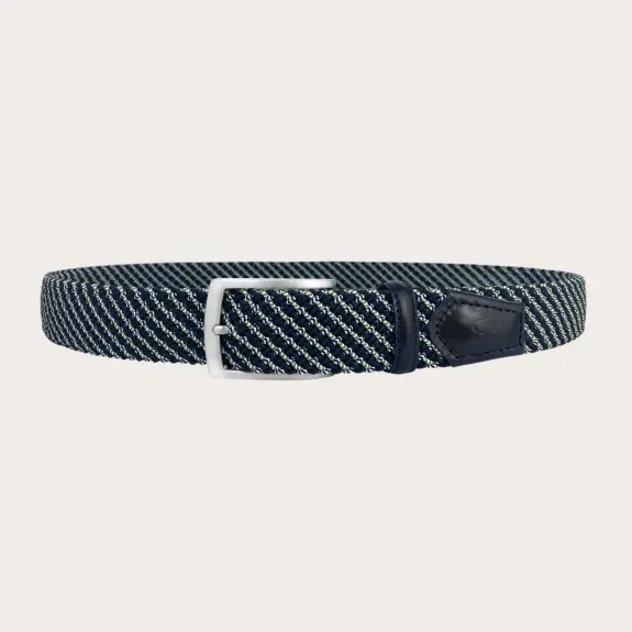 Cintura elastica intrecciata extra lunga tubolare blu con micro righe oblique bianca e verde e bianca e blu, un disegno che crea un effetto tridimensionale unico.
