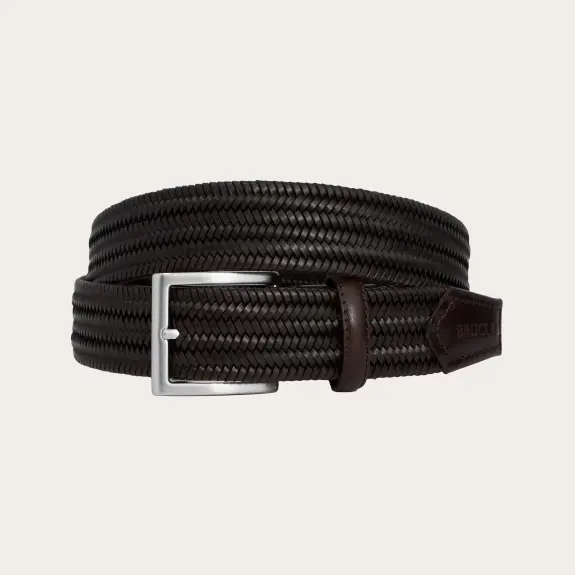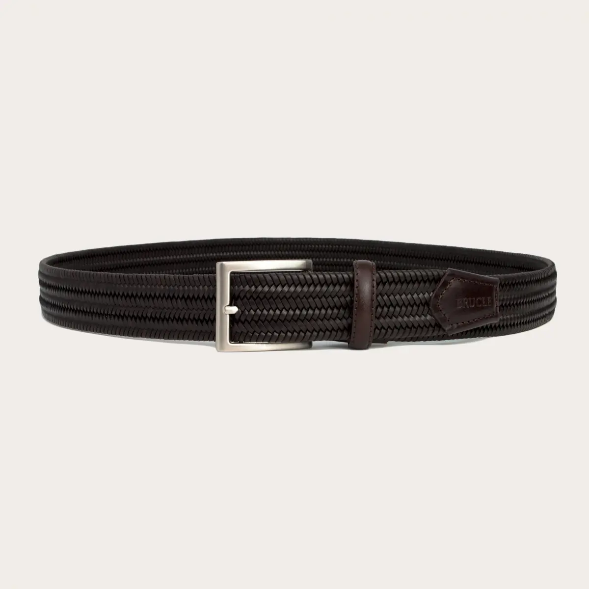 Cintura elastica intrecciata marrone testa di moro in cuoio rigenerato, realizzata a mano con finiture in vera pelle e fibbia lucida in ottone.