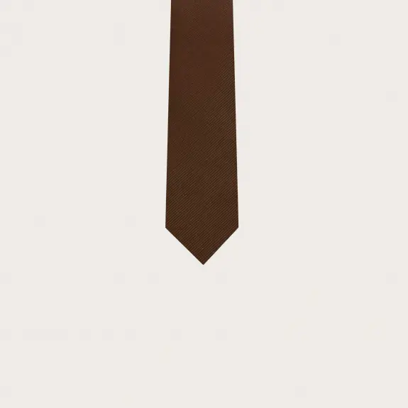 Scopri l'eleganza della cravatta marrone da donna firmata BRUCLE, realizzata a mano in Italia con seta di alta qualità tessuta a Como. Questo accessorio sofisticato, largo 5 cm, si distingue per la sua lucentezza raffinata e il colore caldo, che aggiunge un tocco di stile sobrio e versatile a qualsiasi look.