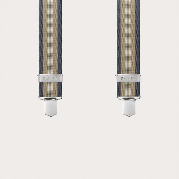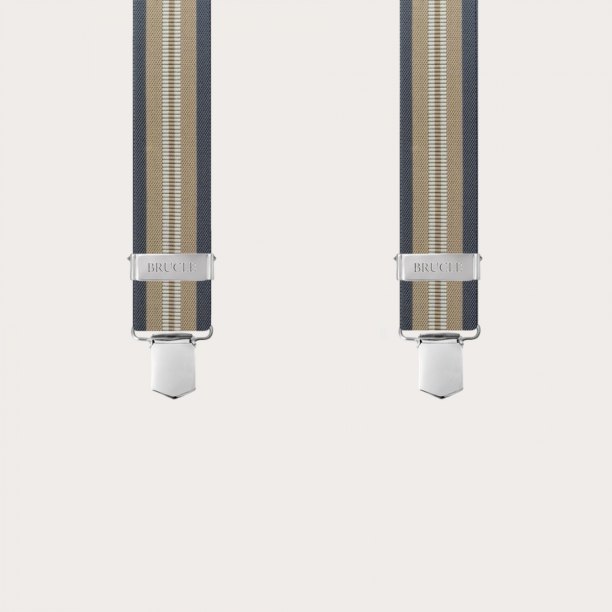 Bretelle rigate beige e blu con 4 aste, di forma a X e attacco solo a clip, interamente fatte a mano in Italia. Impreziosite da un dorsale in vera pelle bovina colorata a mano, sono personalizzabili con incisioni sulle clip, per renderle ancora più originali.