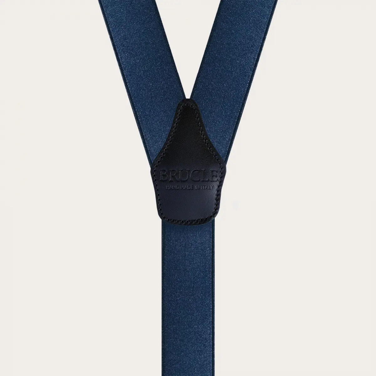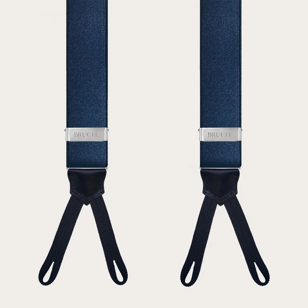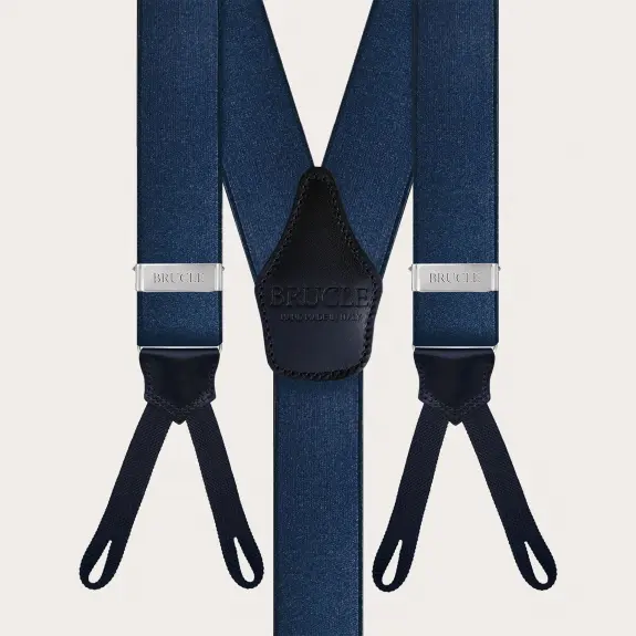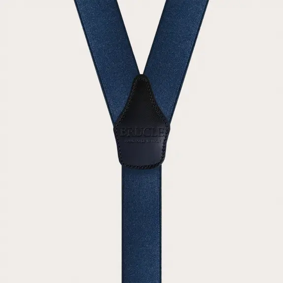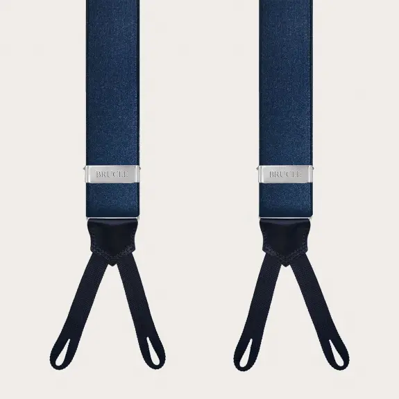 Eleganti bretelle uomo in raso elastico blu con asole per bottoni. Fatte a mano in Italia con materiali di alta qualità e parti in vera pelle tono su tono. Il caldo tono di blu che contraddistingue queste bretelle è facile da abbinare, ed è perfetto per cerimonie ed occasioni formali. Perfette anche come regalo, puoi renderle uniche personalizzando i terminali in pelle con le tue iniziali.