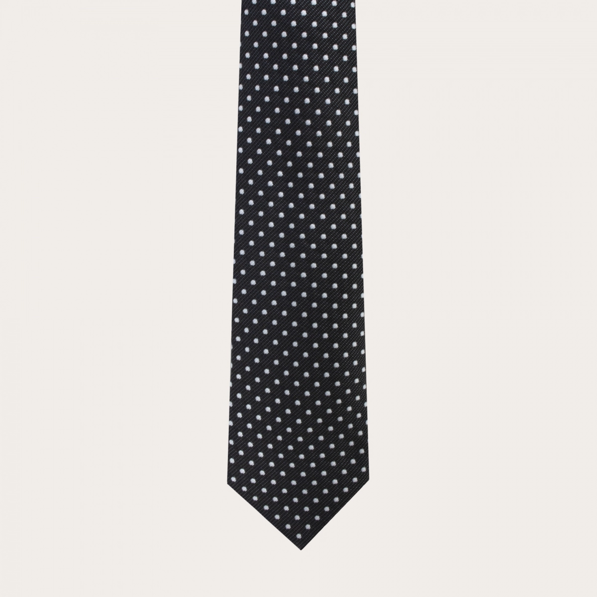 Questa cravatta uomo nera puntaspillo in seta è l'accessorio perfetto per aggiungere un tocco di raffinatezza a qualsiasi abbigliamento formale. Realizzata interamente in seta di alta qualità e made in Italy, questa cravatta presenta un elegante motivo tono su tono che la rende sofisticata e versatile. Il puntaspillo aggiunge un ulteriore tocco di eleganza, rendendola adatta per eventi formali come matrimoni, cene di gala e serate importanti.