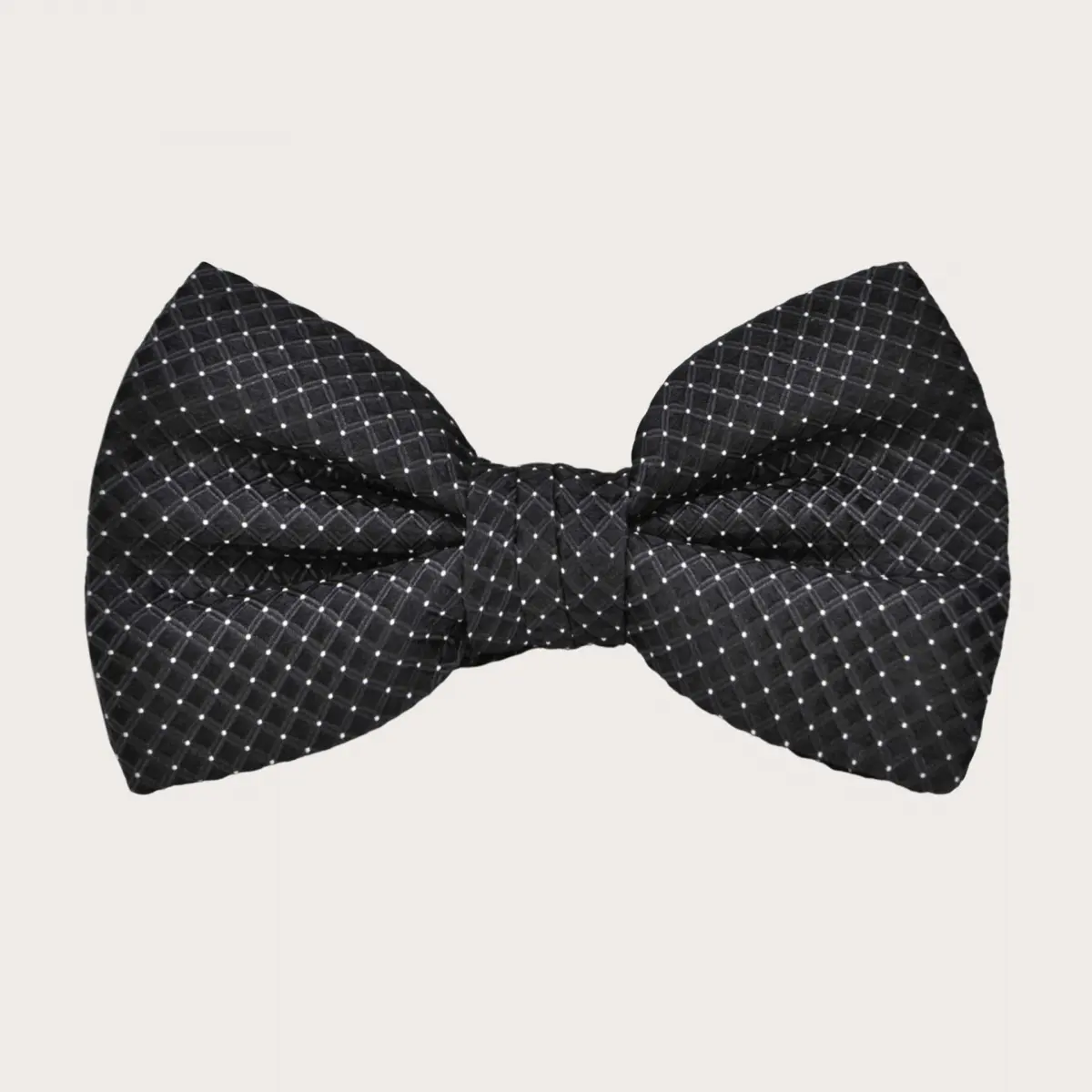 Questo papillon uomo nero fantasia puntaspillo è realizzato in pura seta con lavorazione jacquard tessura a Como, eccellenza mondiale nel mondo dei filati di seta.