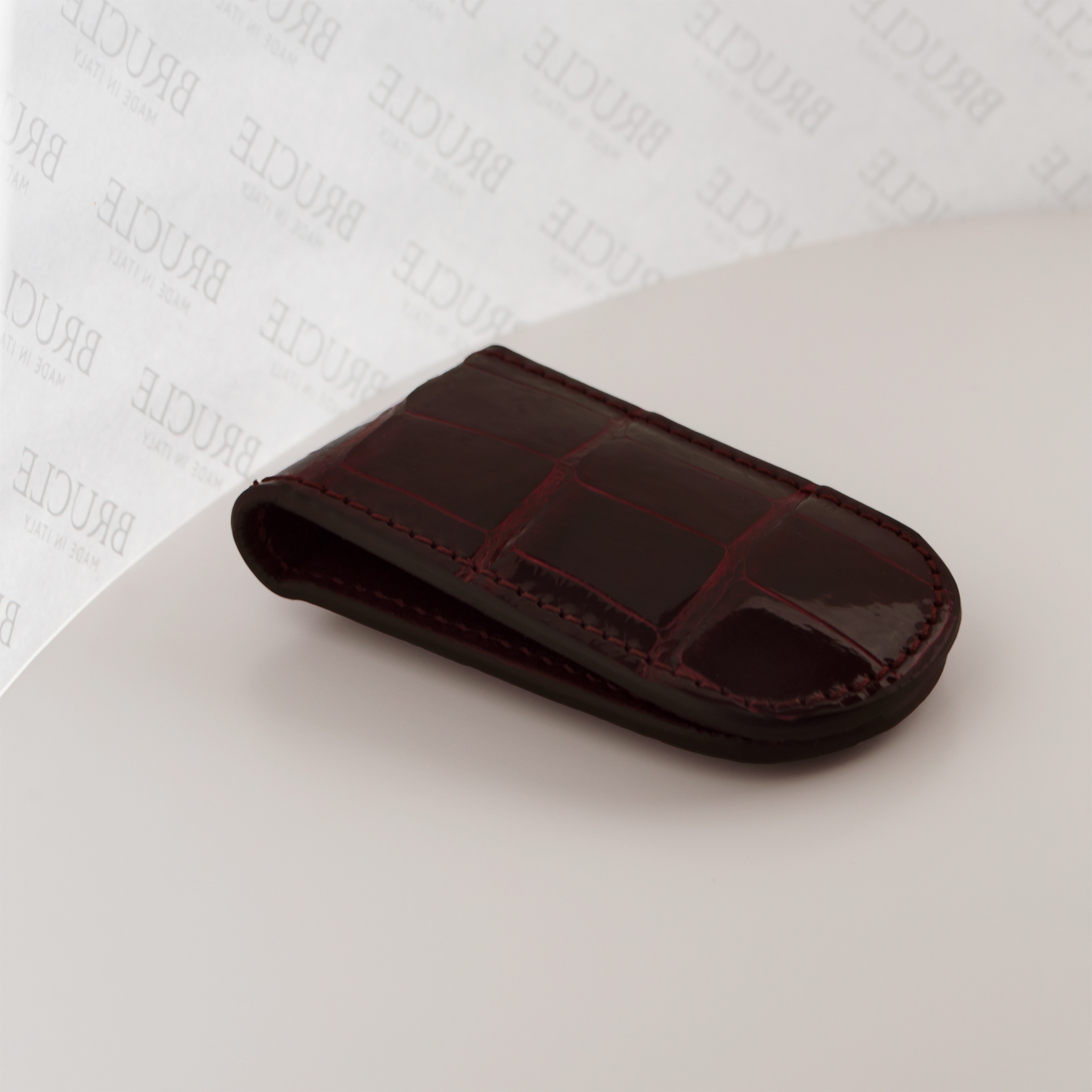 Elegante fermasoldi magnetico in coda di coccodrillo, color rosso bordeaux lucido. Una pratica alternativa al portafoglio. Realizzato interamente a mano in Italia con i migliori pellami esotici certificati. Ogni ferma soldi è un pezzo unico 100% Made in Italy.