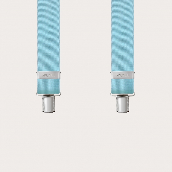 Stile: Bretelle a forma di Y con attacco a clip Composizione elastico: Poliestere 85% Elastodiene 15% Larghezza: 36mm Lunghezza Regolabile: 120cm Colore: azzurro Colore clip: argento Lavorazione: prodotto a mano interamente in Italia Confezione: fornite in un'elegante scatola prodotta in Italia in cartone riciclabile certificato FSCProdotte con materiali di prima scelta