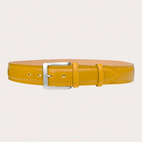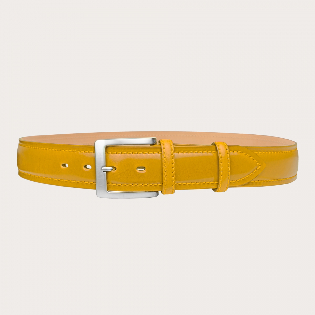 La cintura gialla in pelle bottalata Brucle rappresenta l'accessorio ideale per chi vuole dare un tocco di colore al proprio outfit. Realizzata in Italia con materiali di alta qualità, la cintura è in vera pelle e ha un colore unico, che la rende perfetta per chi vuole distinguersi con stile. La texture bottalata aggiunge un tocco di originalità e di sportività, perfetto per ogni occasione. La cintura gialla è facile da accorciare grazie alla fibbia smontabile, permettendovi di personalizzare la lunghezza in base alle vostre esigenze. Inoltre, la cintura è personalizzabile con l'incisione di iniziali, date o loghi, rendendola un accessorio unico e personale. Il giallo è un colore che risalta e sorprende, perfetto per chi vuole essere notato e distinguersi dalla massa: questa cintura gialla vi permetterà di esprimere la vostra personalità e il vostro gusto per la moda in modo originale e sofisticato.