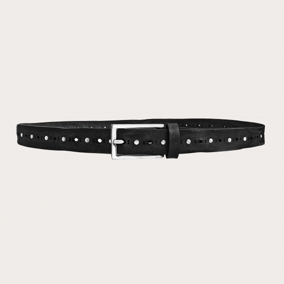 Cintura trendy nera in vera pelle concia vegetale, impreziosita con borchie e incisione al laser. Una cintura adatta a un look modaiolo e di tendenza, interamente fatta a mano in Italia. La fibbia lucida valorizza ulteriormente il design ricercato di questa cintura.