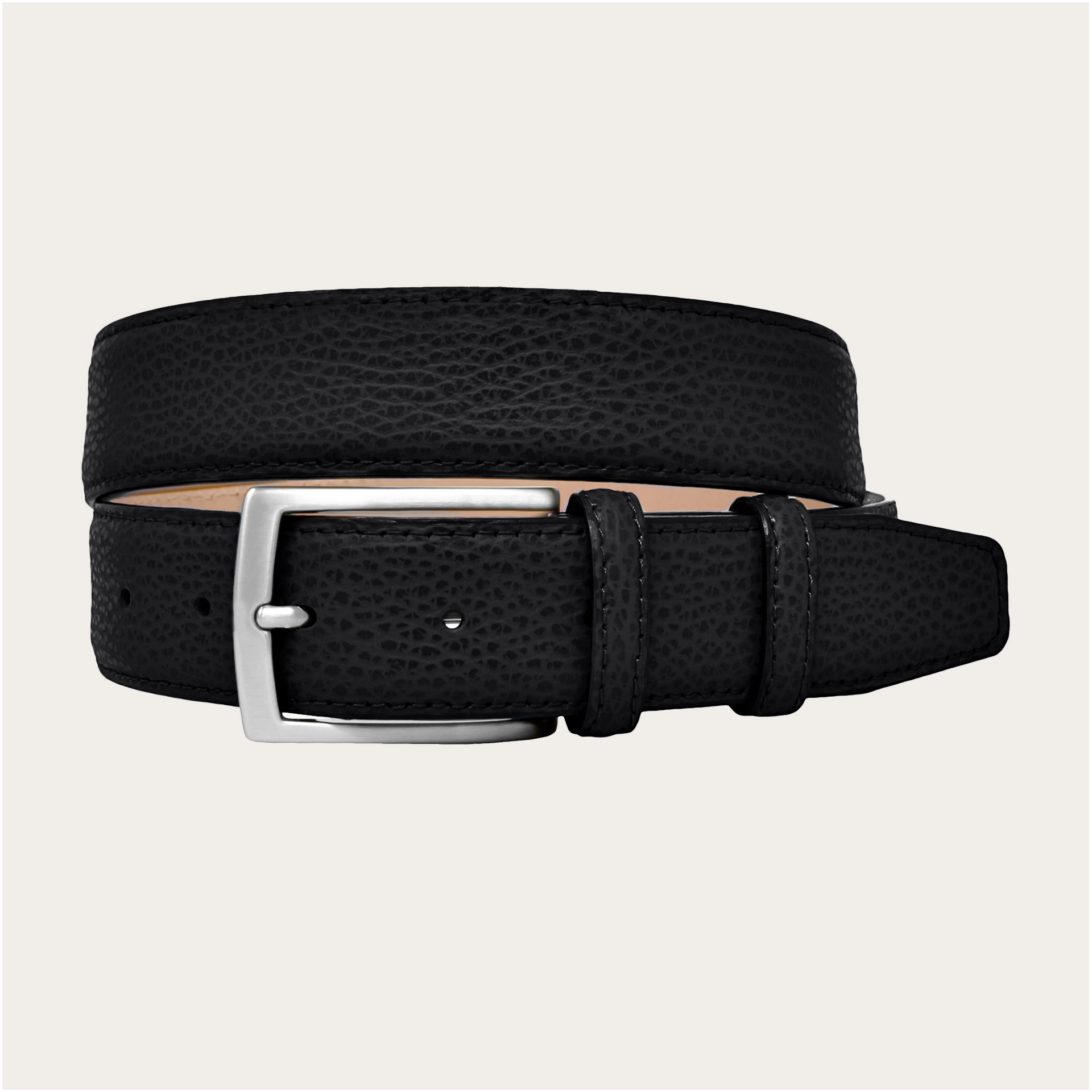 Cintura uomo in morbida pelle nera stampa alce con effetto bottalato, impreziosita da fibbia satinata in ottone. Sportiva e confortevole, è un modello versatile che si adatterà ad ogni tuo outfit.