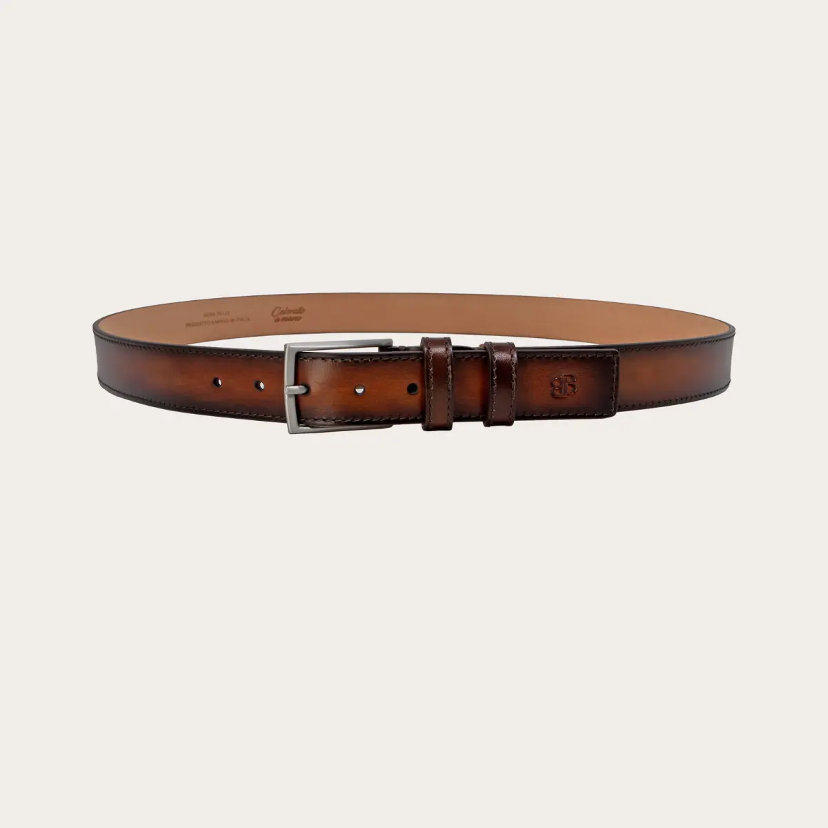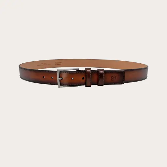 Cintura piatta in pelle con punta quadrata di colore marrone sfumato cacao, un prodotto artigianale di alta qualità fatto a mano in Italia. La sua patina unica la rende ancora più elegante e sofisticata, mentre la fattura artigianale garantisce la sua durata nel tempo. La cintura è completamente nichel free.