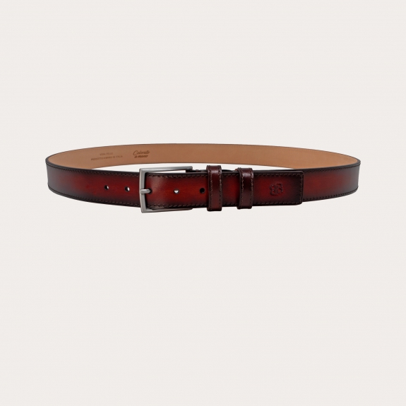 Questa cintura piatta colorata a mano bordeaux e marrone testa moro è l'emblema della qualità artigianale italiana e della grande attenzione ai dettagli.