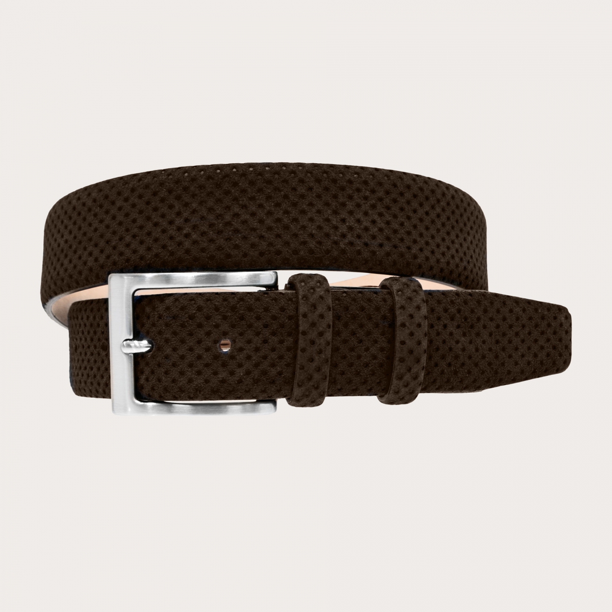 Cintura marrone traforata in vera pelle scamosciata, perfetta per uno stile casual e sofisticato. Lavorazione artigianale 100% Made in Italy.