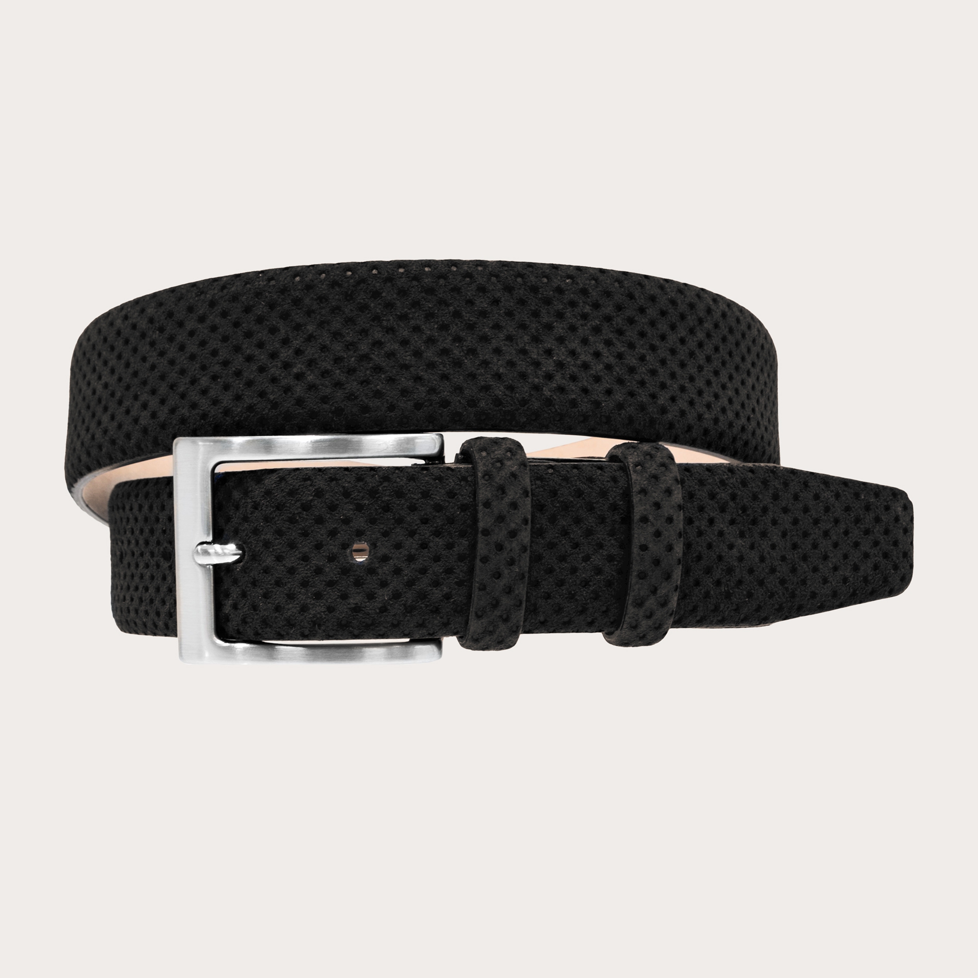 Cintura nera traforata in vera pelle scamosciata, ideale per uno stile casual e sofisticato. Realizzata artigianalmente al 100% in Italia.