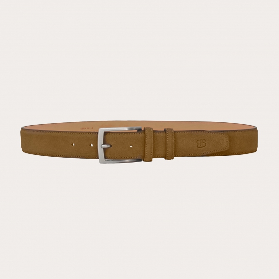 Cintura scamosciata in un originale tono di marrone, il terra. Un modello in vera pelle scamosciata di alta qualità, rifinita con una fibbia in ottone pieno nichel free e fodera in nabuk primo fiore. Un modello unisex nella classica altezza da 3.5 cm, versatile e ideale per un look ricercato. Personalizzabile con incisioni su fibbia, punta e fodera.