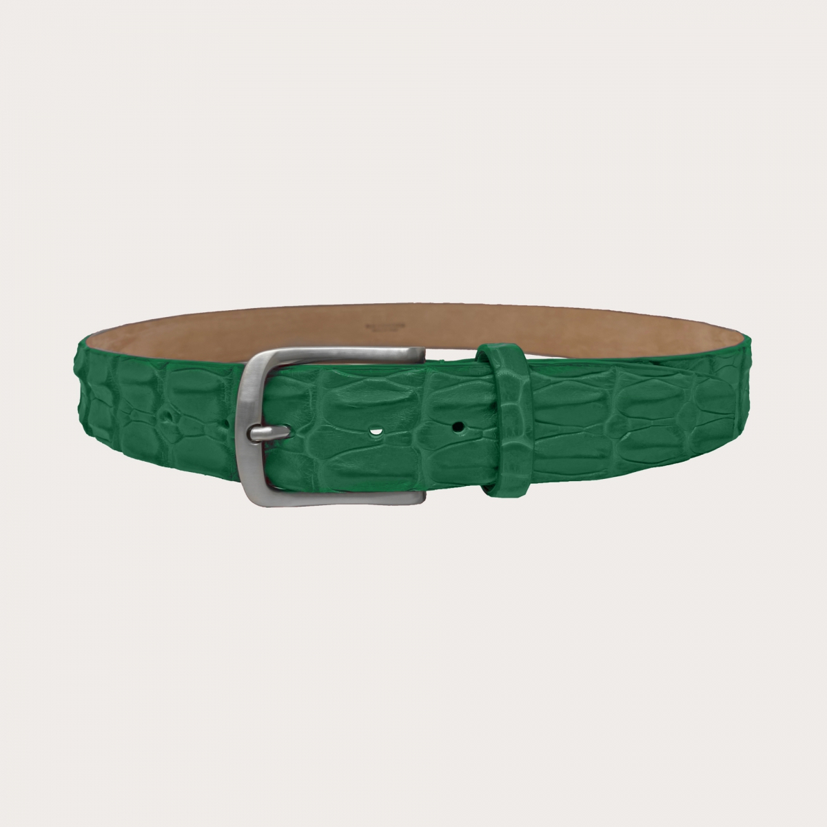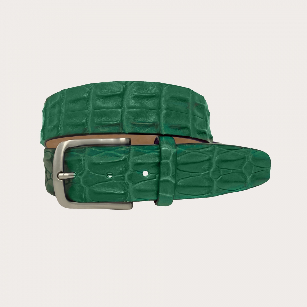 Cintura casual da uomo e da donna in vera pelle di coccodrillo, color smeraldo. Un accessorio dalla bellezza esotica, reso unico dalle finiture artigianali; perfetta per stupire.