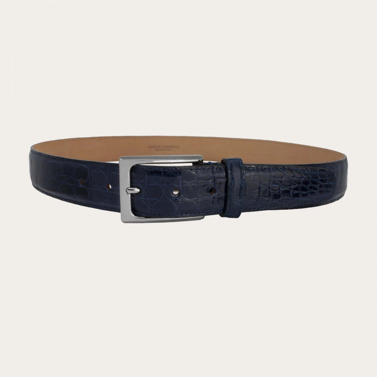 Cintura da uomo in vera pelle di fianco di coccodrillo. Questa cintura blu è resa ancor più elegante e impreziosita da una fibbia in ottone color argento solida e duratura. Una cintura dalla bellezza senza tempo.
