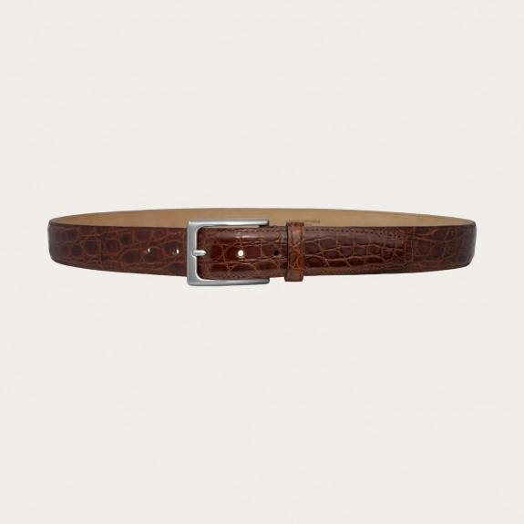 Cintura uomo in vero coccodrillo realizzata col fianco, la parte più pregiata. Sorprendente e facile da abbinare nel marrone legno, tinta calda che valorizza la pelle, e rifinita con i migliori materiali per fodera e fibbia.