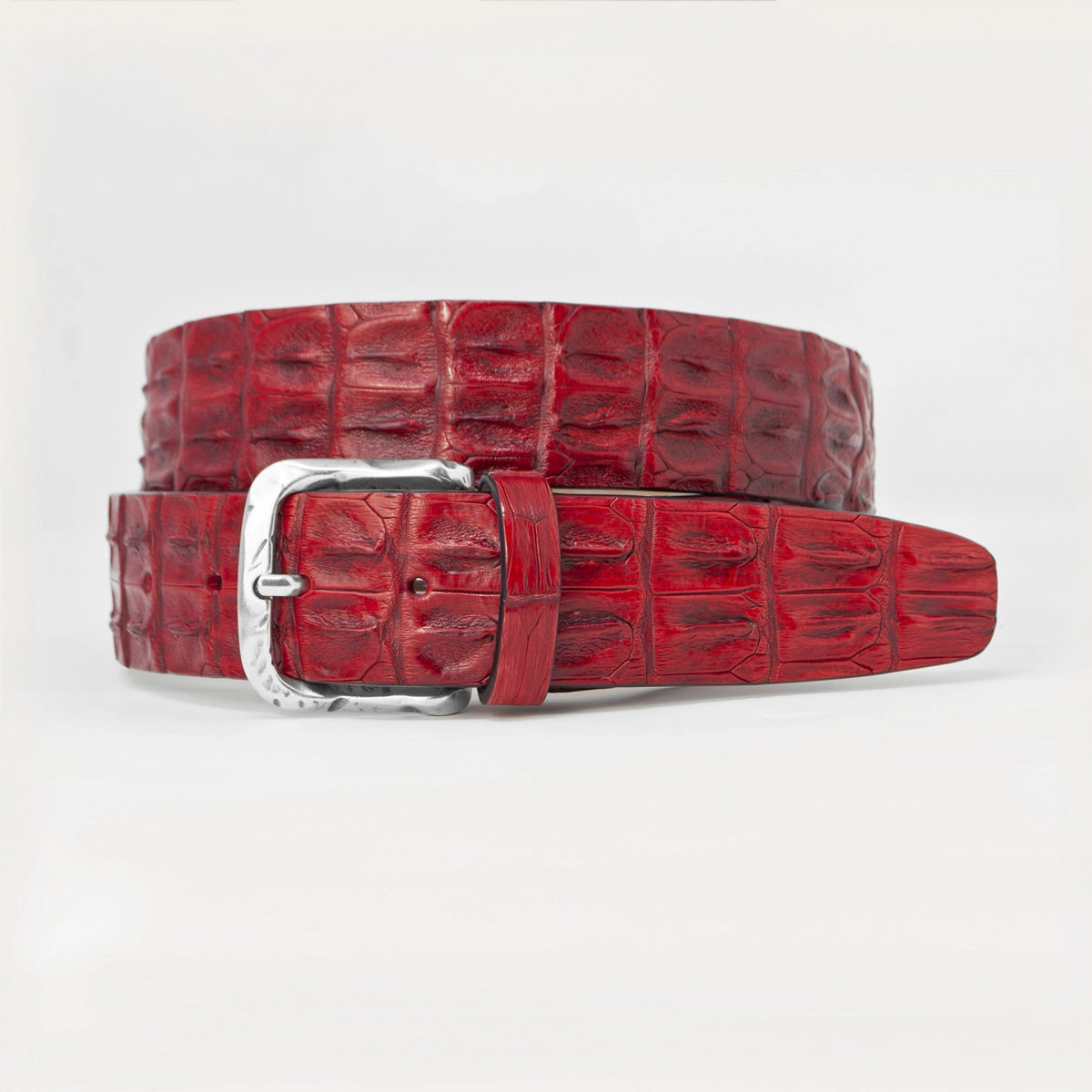Cintura casual in vera pelle di coccodrillo. Un modello in cui la bellezza delle squame della schiena di coccodrillo è accentuata dalla colorazione rosso intenso.