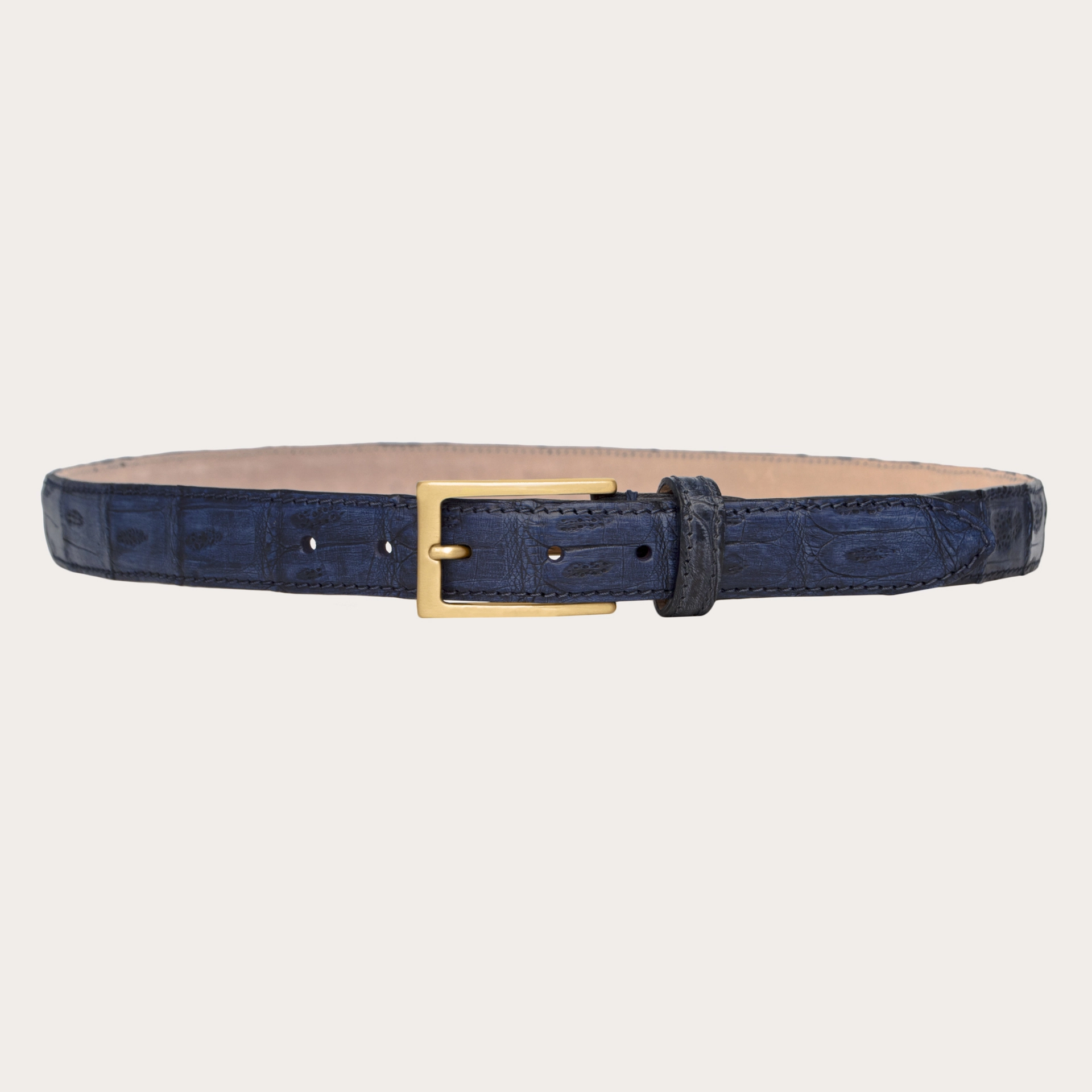 Cintura bassa in vera coda di coccodrillo colorata a mano, colore blu. Questa cintura è interamente fatta a mano in Italia, e completata da una fibbia tinta oro senza nichel in ottone pieno. Un accessorio unico ed esclusivo, frutto del made in Italy.