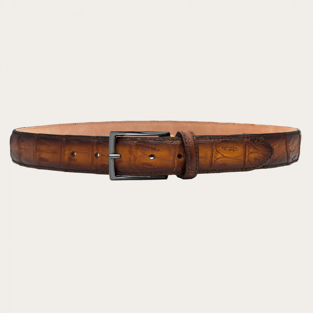 Raffinata cintura patinata nickel free in coda di coccodrillo, marrone e gold