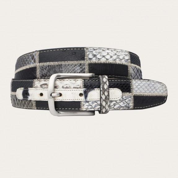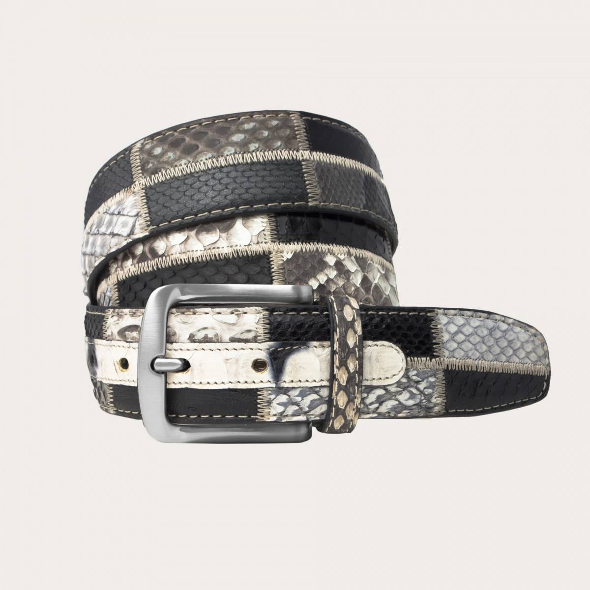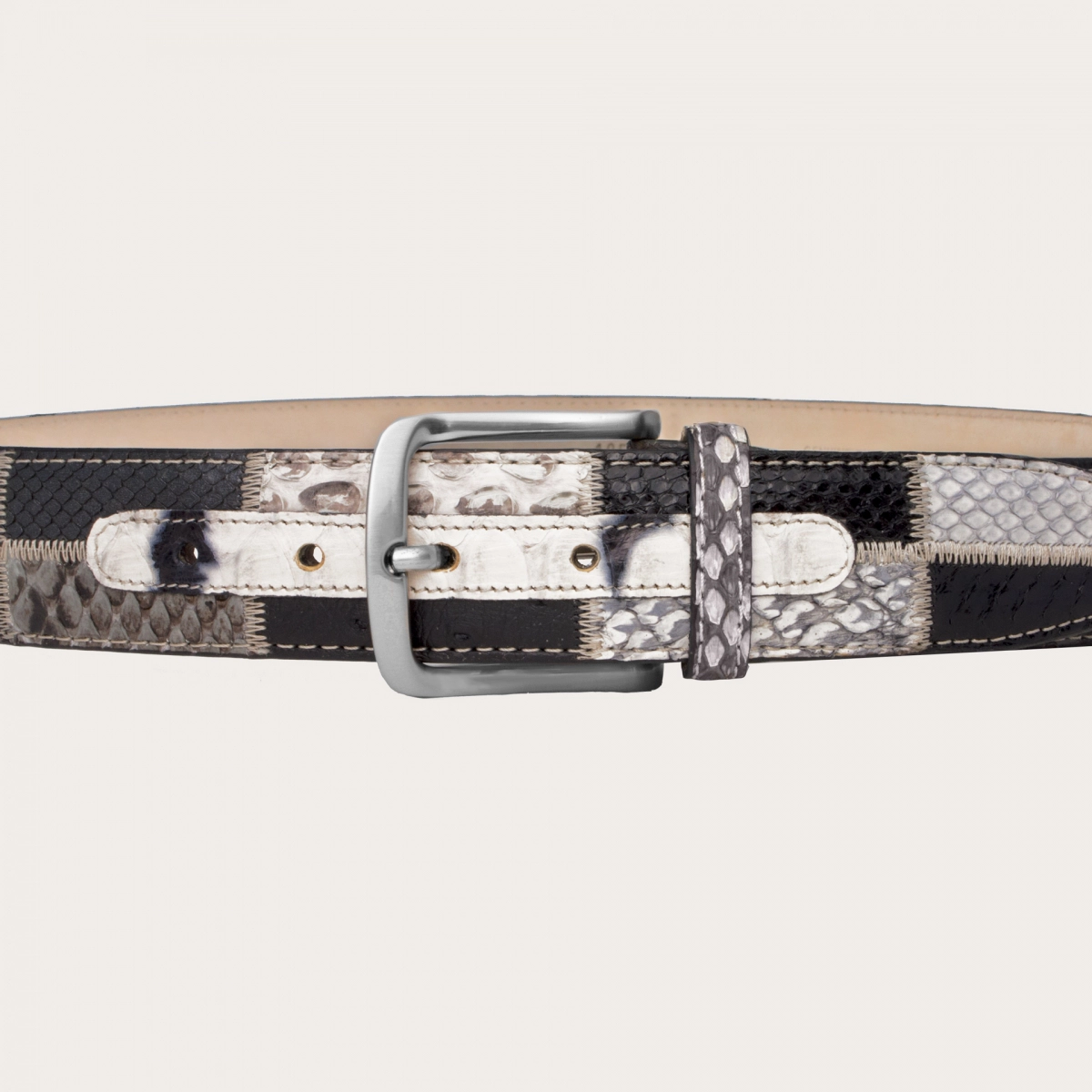 Cintura in vero pitone realizzata a mano in Italia con lavorazione patchwork multicolore. Un pezzo unico che non passa inosservato.