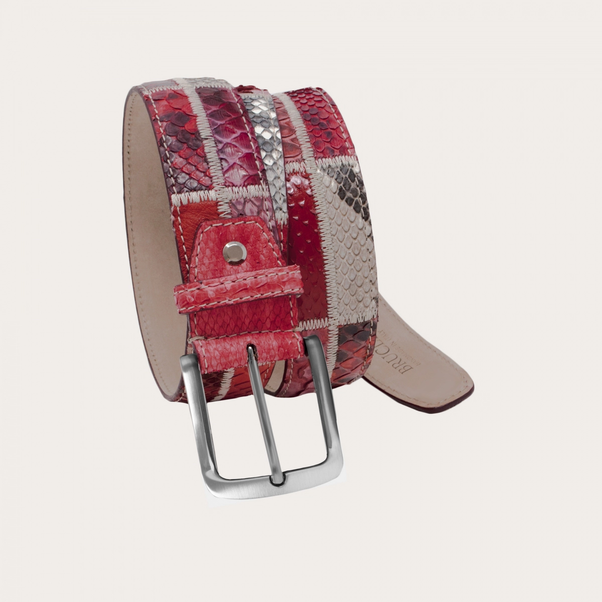 Cintura in vero pitone, realizzata con lavorazione patchwork a rettangoli nei toni del rosso. Colorata e versatile, ha tutto il fascino dei pellami esotici. Il design unisex rende questa cintura di pitone adatta a tutti.