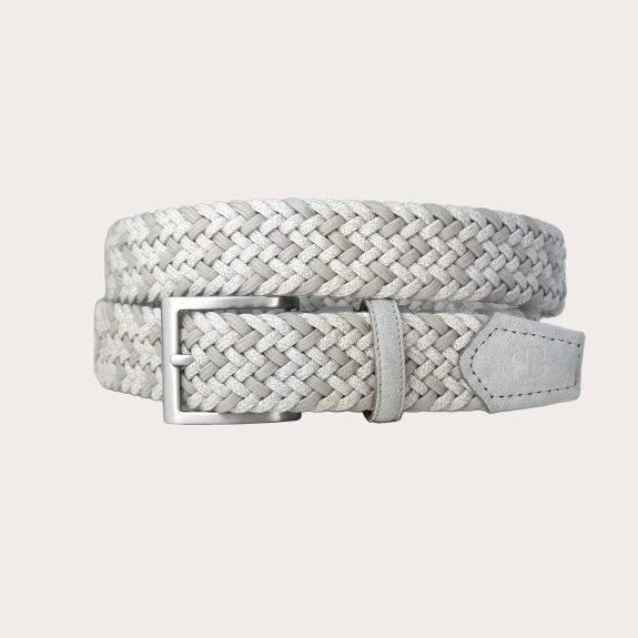 Cintura grigia intrecciata elastica in cuoio con anima in elastan e finiture in pelle. Pratica, elastica e versatile, adatta per qualsiasi tipo di look.