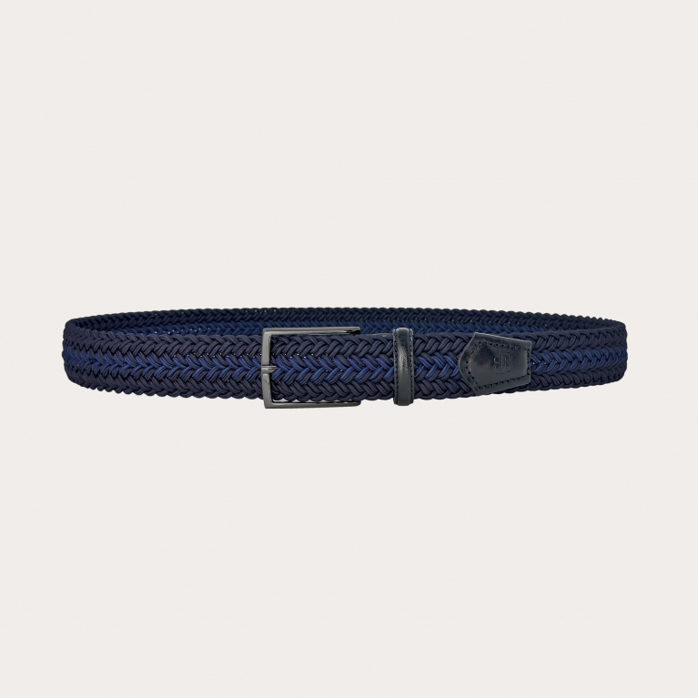 Cintura melange nera intrecciata elastica in lana con fibbia nichel free color rutenio e pelle bottalata in tinta.