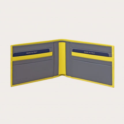 Mini portafoglio compatto in pelle saffiano con fermasoldi e portamonete, blu e giallo