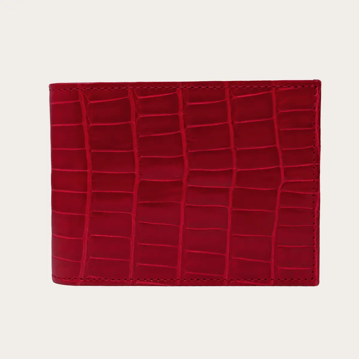 Elegante portafoglio con portamonete in vera pelle di alligatore, squama quadrata, di un acceso e sorprendente color rosso per la nuova collezione luxury BRUCLE. Un portafoglio in alligatore in cui il colore dà ancora maggior risalto alla bellezza naturale della pelle esotica. Un accessorio elegante e raffinato, realizzato a mano in Italia, ideale per chi cerca il massimo della raffinatezza.
