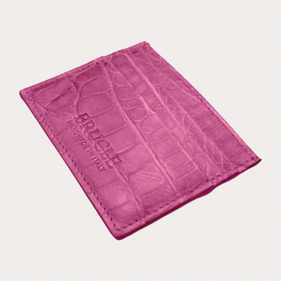 Custodia porta carte di credito rosa in vera pelle di alligatore, con una finitura semi lucida che valorizza la bellezza della vera pelle esotica.