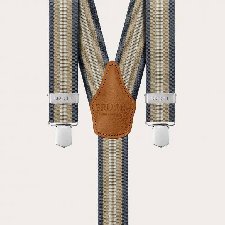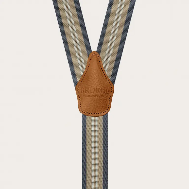 Raffinato abbinamento di colori per questo modello di bretelle elastiche, in cui al blu delle bretelle si unisce il colore testa moro delle parti in pelle.