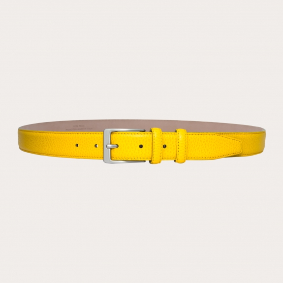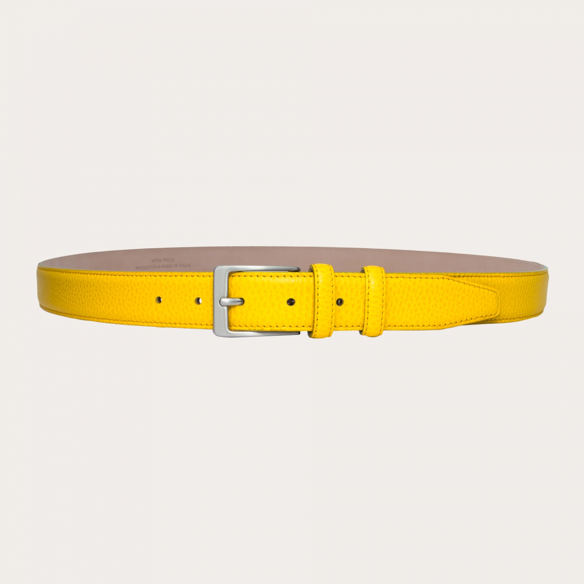 La cintura gialla in pelle bottalata Brucle rappresenta l'accessorio ideale per chi vuole dare un tocco di colore al proprio outfit. Realizzata in Italia con materiali di alta qualità, la cintura è in vera pelle e ha un colore unico, che la rende perfetta per chi vuole distinguersi con stile. La texture bottalata aggiunge un tocco di originalità e di sportività, perfetto per ogni occasione. La cintura gialla è facile da accorciare grazie alla fibbia smontabile, permettendovi di personalizzare la lunghezza in base alle vostre esigenze. Inoltre, la cintura è personalizzabile con l'incisione di iniziali, date o loghi, rendendola un accessorio unico e personale. Il giallo è un colore che risalta e sorprende, perfetto per chi vuole essere notato e distinguersi dalla massa: questa cintura gialla vi permetterà di esprimere la vostra personalità e il vostro gusto per la moda in modo originale e sofisticato.